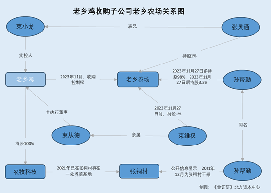 上述可知,老乡农场成立于2022年3月,彼时,孙帮勤、老乡鸡实控人之一束小龙表兄张灵通、老乡鸡非施行董事束从德的亲属束别离持股98%、1%、1%。2023年11月,老乡农场变动股权后,孙帮勤、张灵通、老乡鸡子公司安徽老乡鸡别离持股3。3%、1%、95。7%,自此,老乡农场成为老乡鸡的子公司。